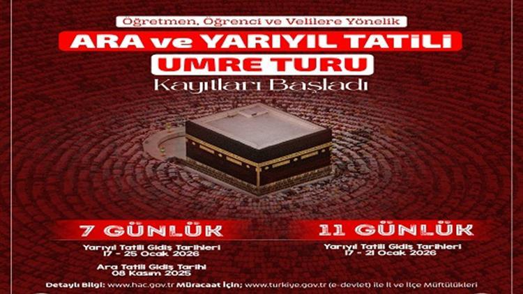 Diyanet İşleri Başkanlığı Hac ve Umre Hizmetleri Genel Müdürlüğü 2025-2026 Yılı Umre Organizasyonu kapsamında öğretmen, öğrenci ve velilere yönelik ara ve yarıyıl tatili umre turlarına kayıtlar başladı.