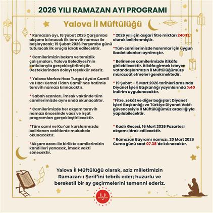 🌙 Yalova İl Müftülüğü olarak, aziz milletimizin Ramazan-ı Şerif’ini tebrik eder; huzurlu ve bereketli bir ay geçirmelerini temenni ederiz.